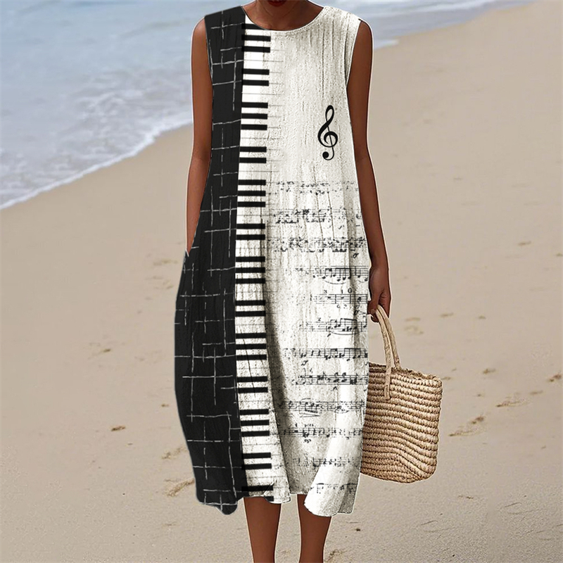 Music Notes & Piano Inspired Contrast Flowy Linen Dress
