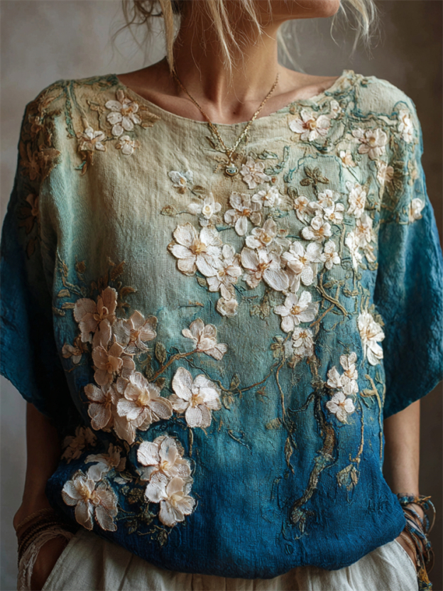 Oil Painting Almond Blossom Embroidered Gradient Linen Tunic