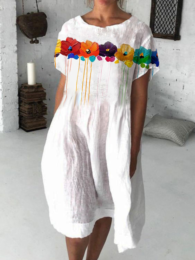 Rainbow Flowers Oil Painting Pleated Midi Dress