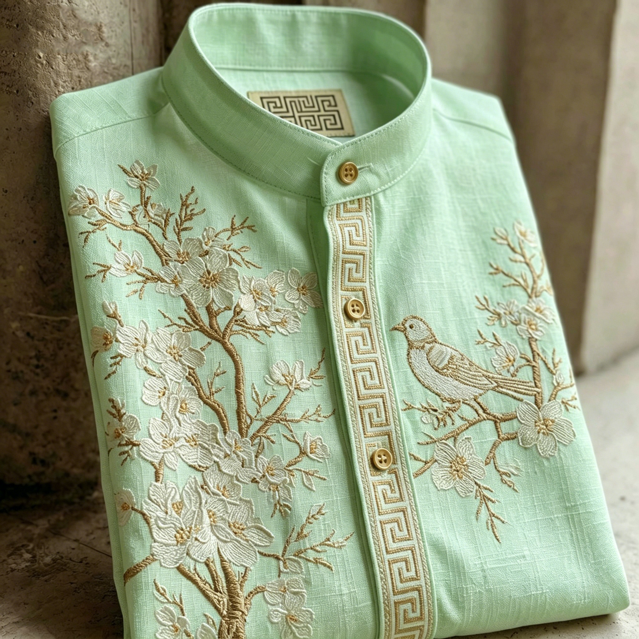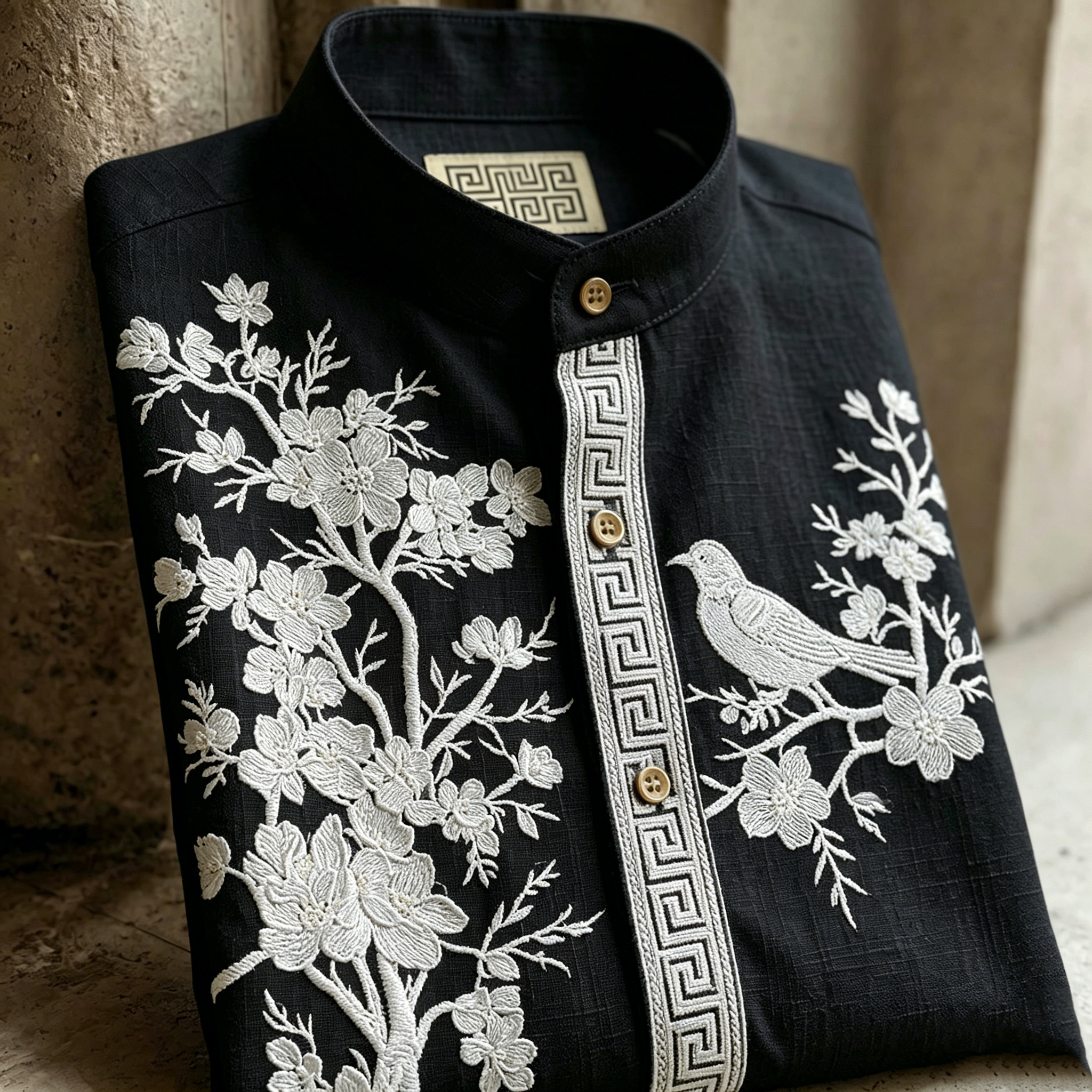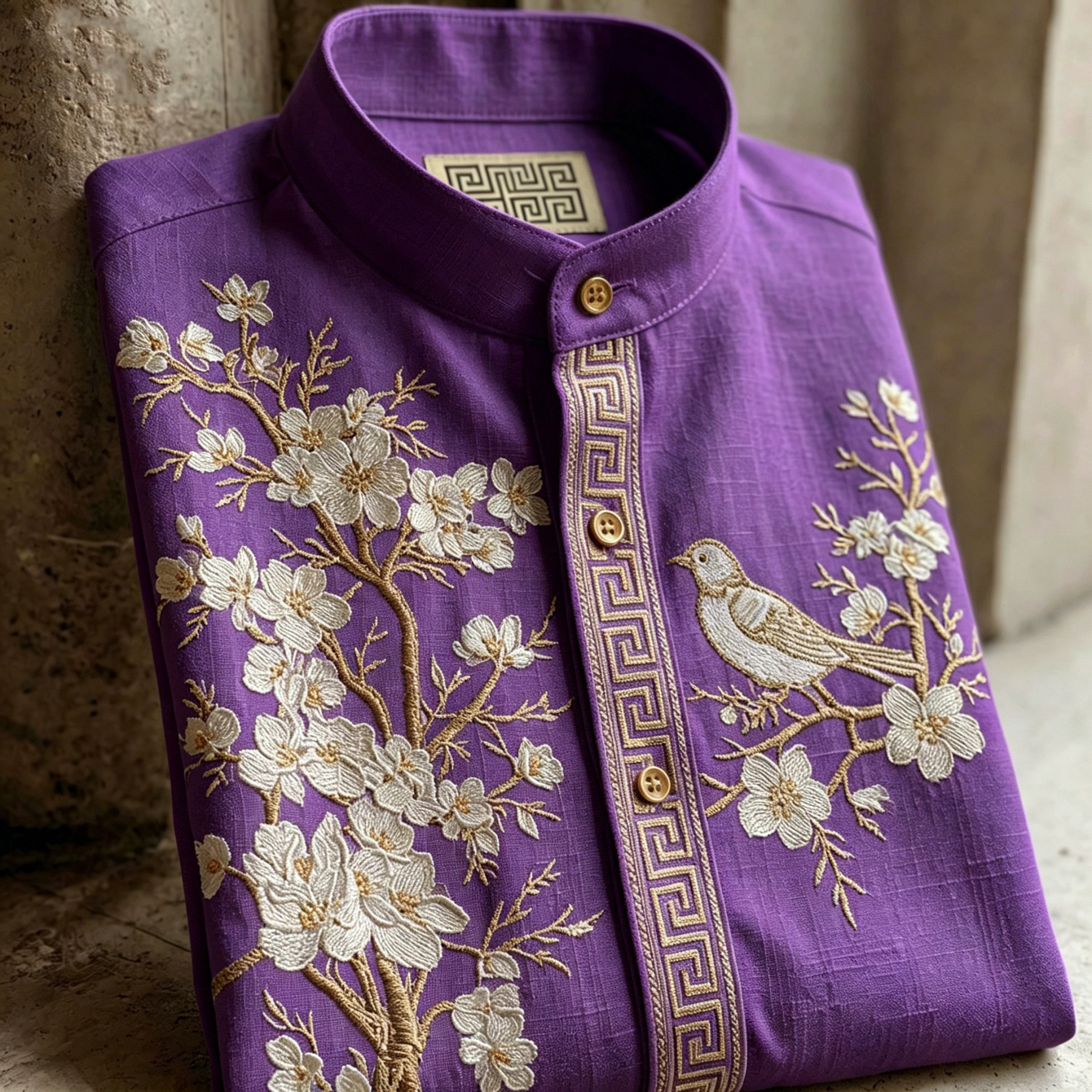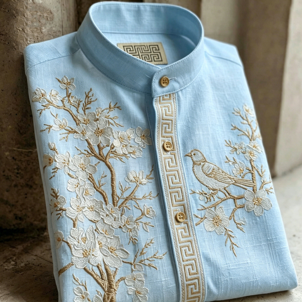 Retro Cherry Blossom And Bird Pattern Short-sleeve Shirt