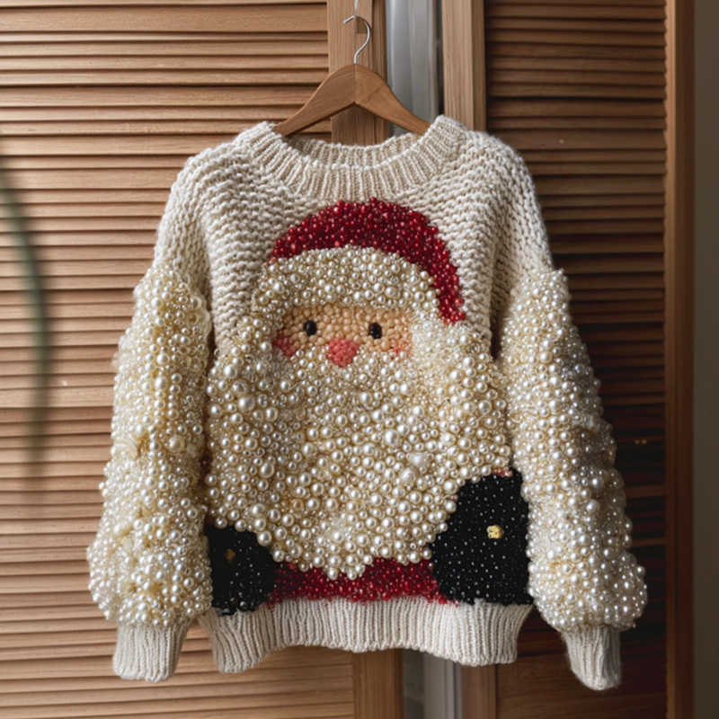 Santa Claus Embroidered Pearl Crew Neck Sweater