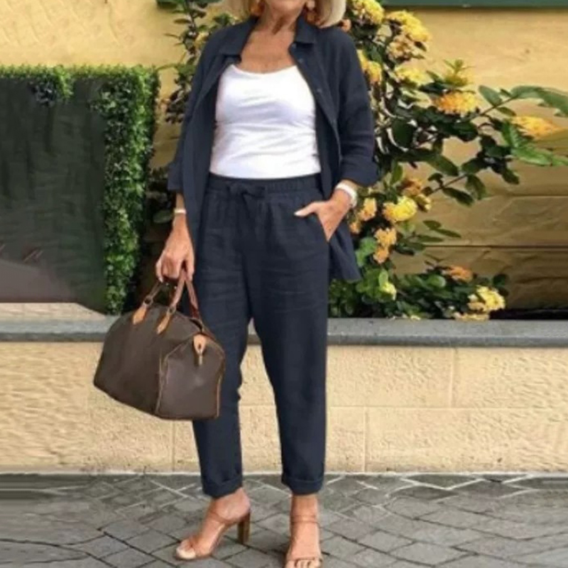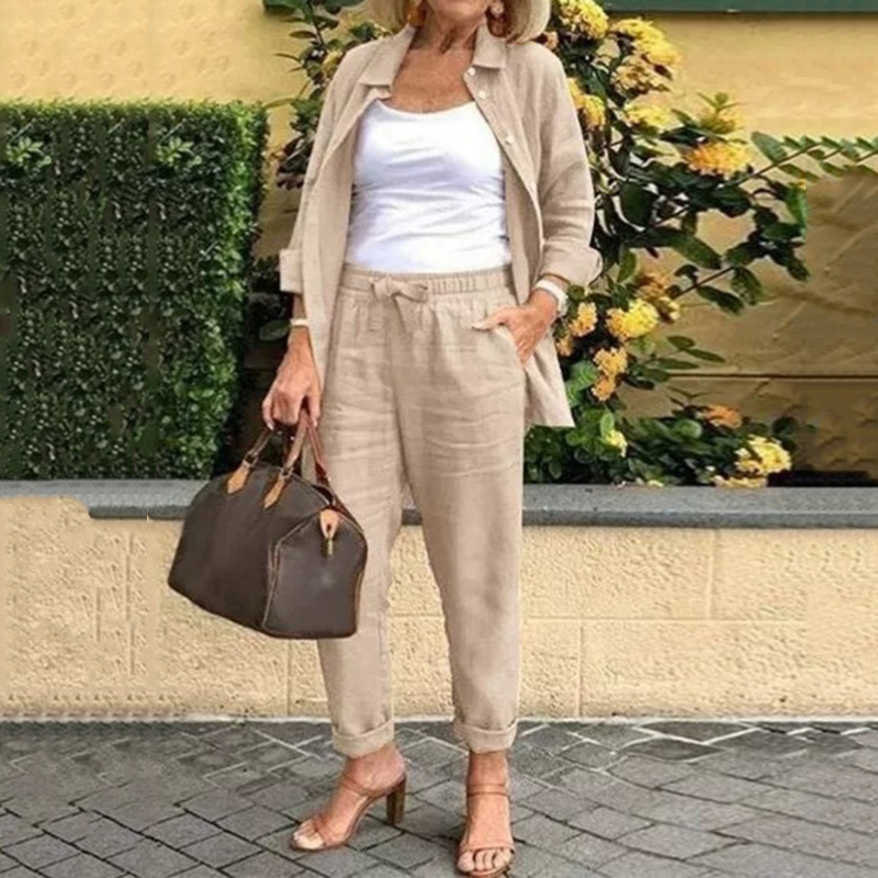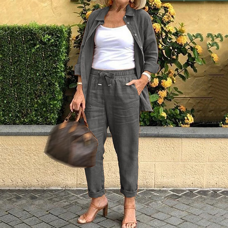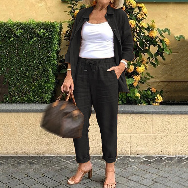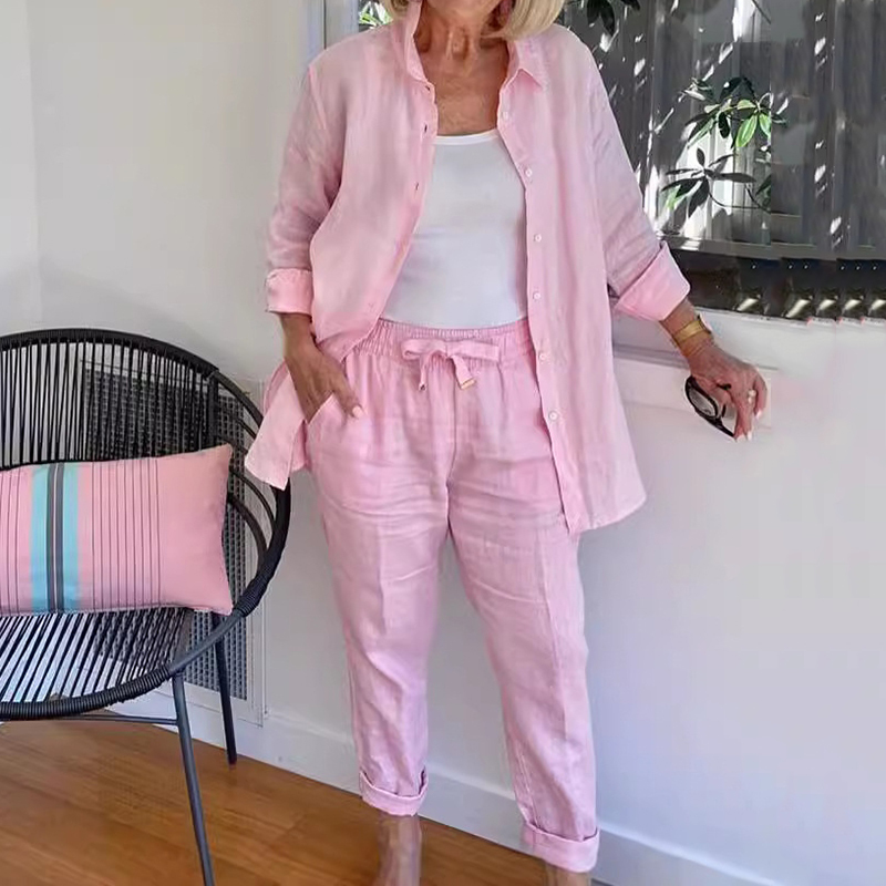 Solid Color Simple Linen Blend Shirt Two Piece Set