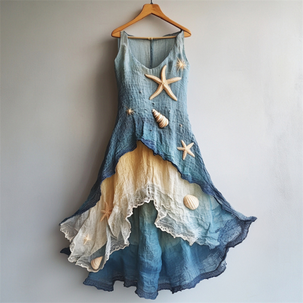 Starfish & Sea Shells Embroidered Sea Waves Layered Flowy Linen Dress