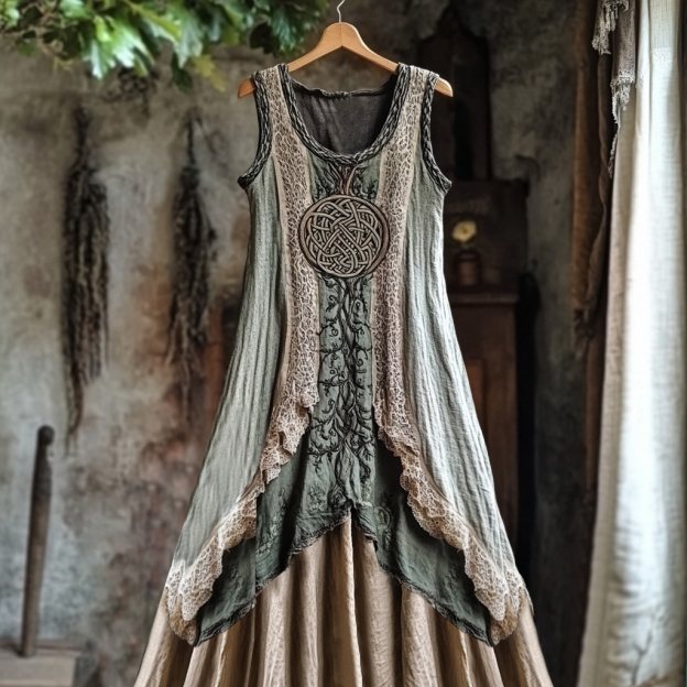 Tribal Celtic Knot Plant Embroidery Lace Patchwork Art Linen Tank Dress