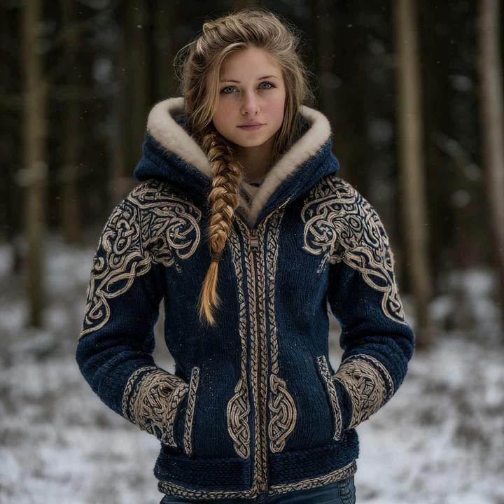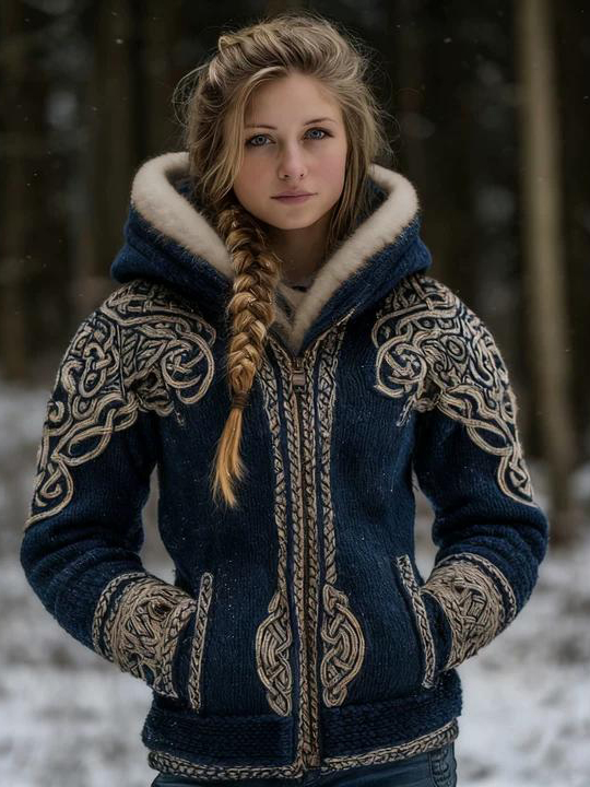 Viking Celtic Knot Art Cozy Fur Trim Hooded Cardigan