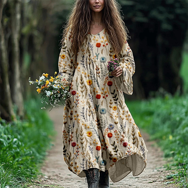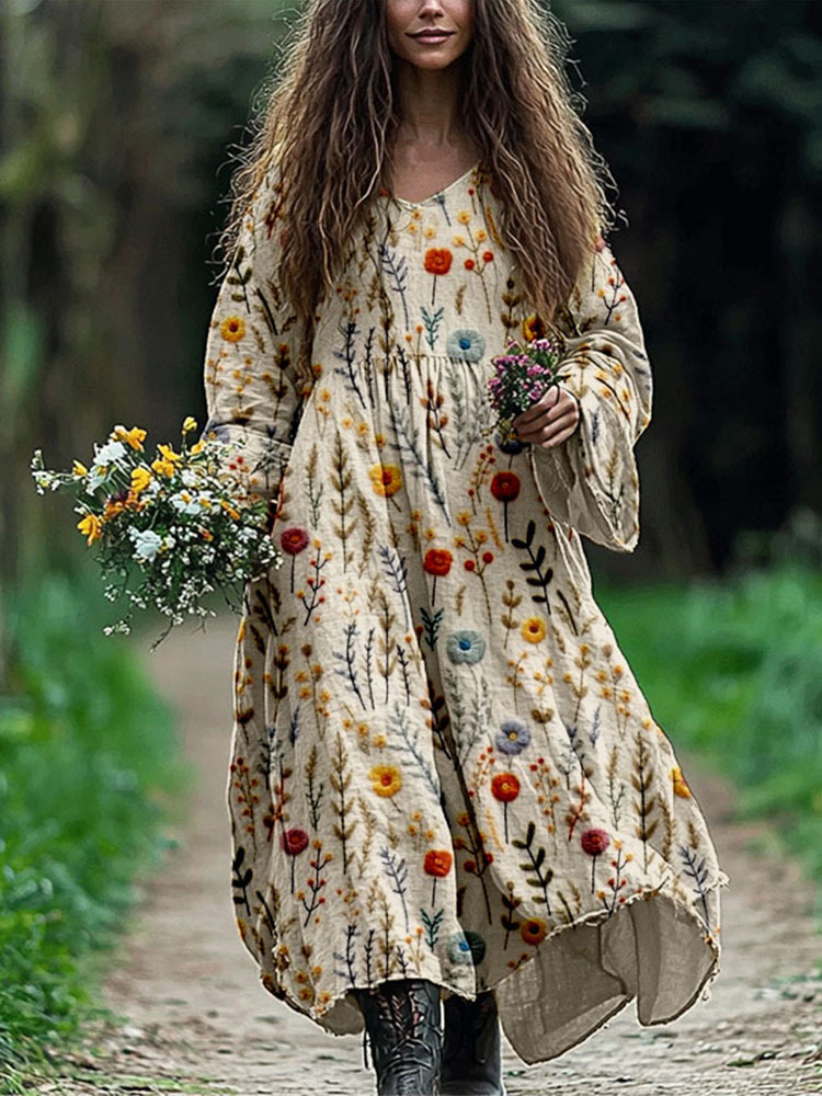 Vintage Boho Flowers Embroidered Linen Blend Maxi Dress