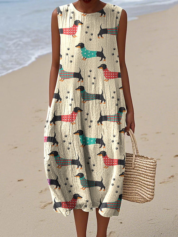Vintage Cute Dachshund Art Print Linen Sleeveless Dress