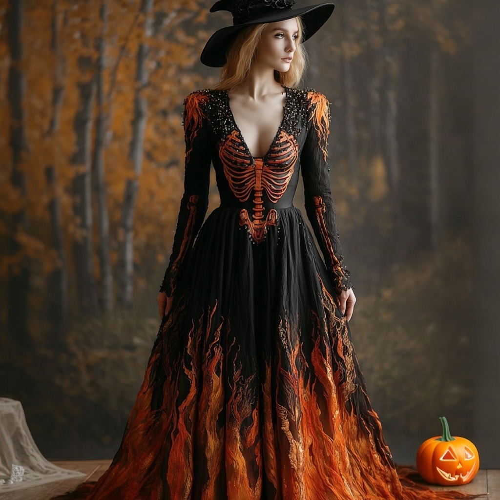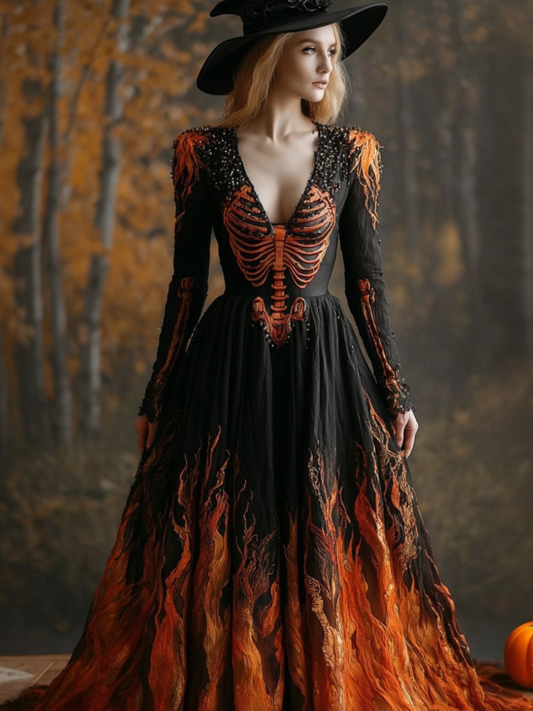 Vintage Flamed & Skeleton Embroidered Flowy Maxi Dress