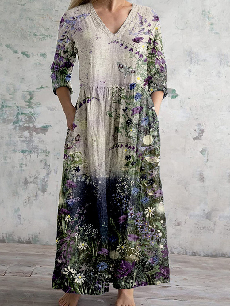 Vintage Floral Art Pattern Linen Blend Maxi Dress