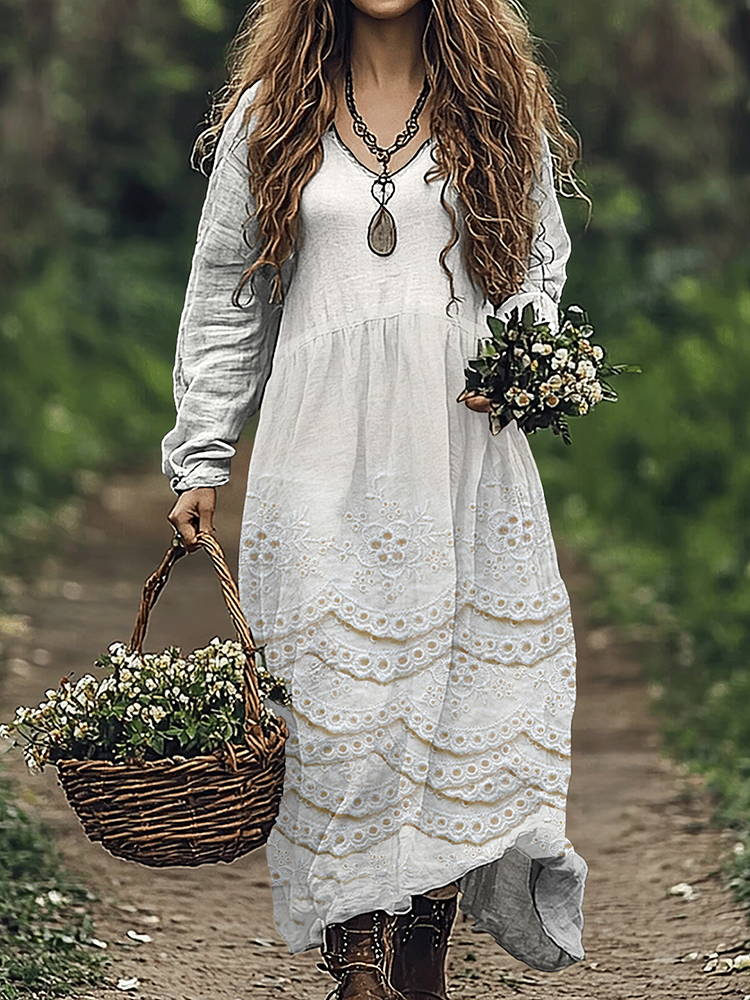 Vintage Floral Lace Embroidered Art Women's Linen Dress