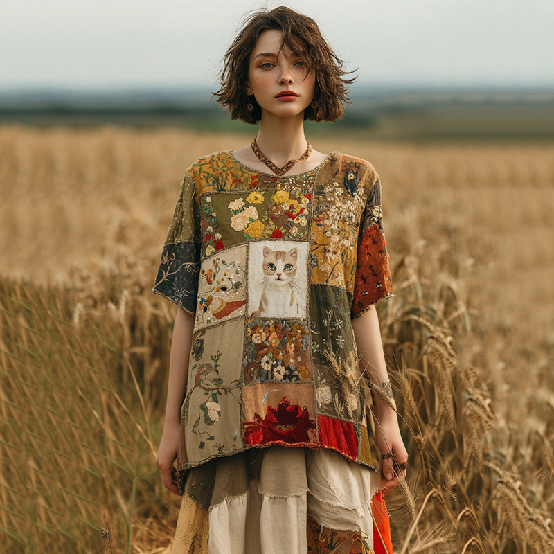 Vintage Japanese Cute Cat Floral Patchwork Linen T-shirt