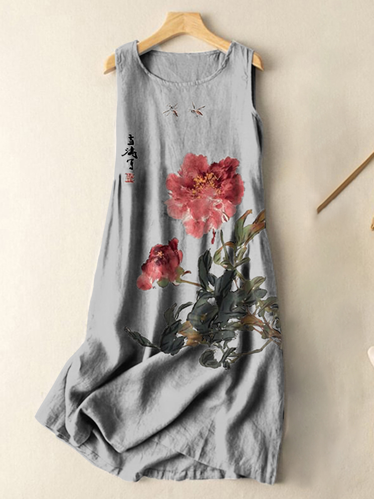Vintage Japanese Ink Flower Calligraphy Art Print Sleeveless Cotton And Linen Midi Dress