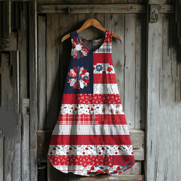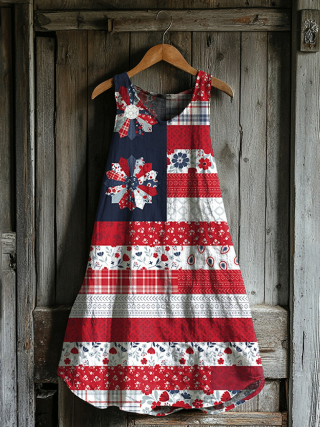 Vintage Loose Independence Day American Beauty Flag Panel Art Linen Tank Dress