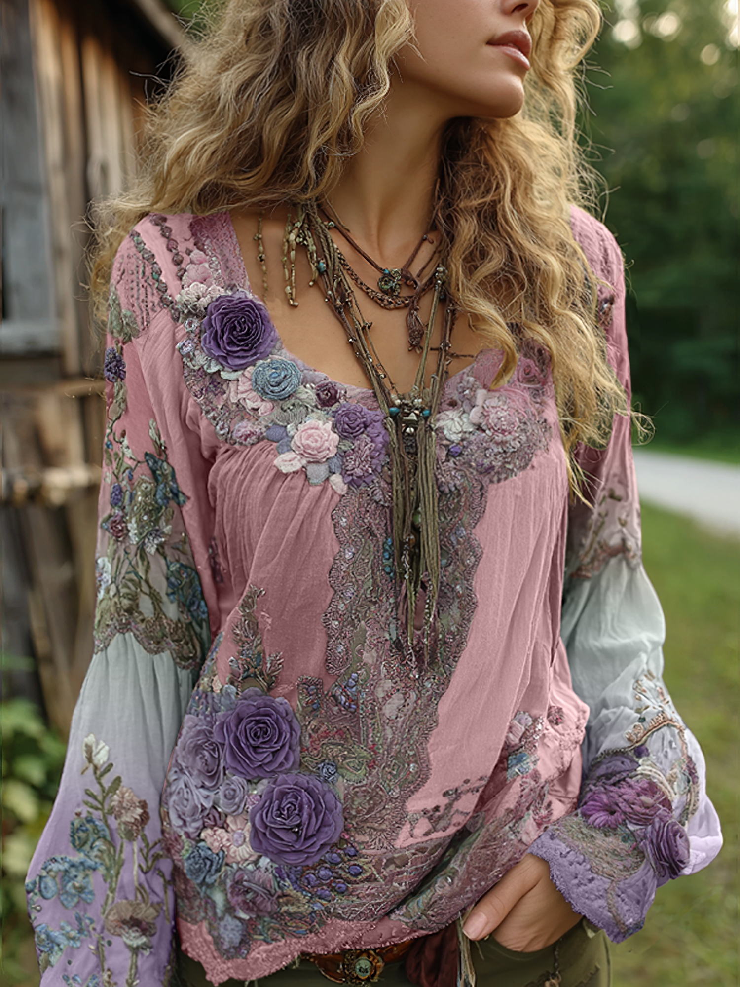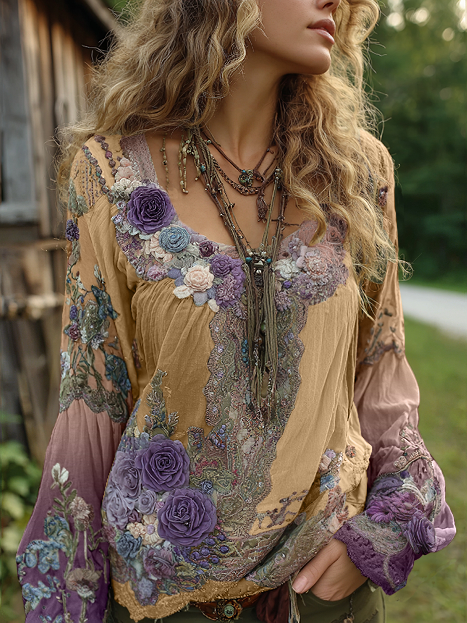 Vintage Purple Lavender And Floral Embroidered Linen Long Sleeve Shirt