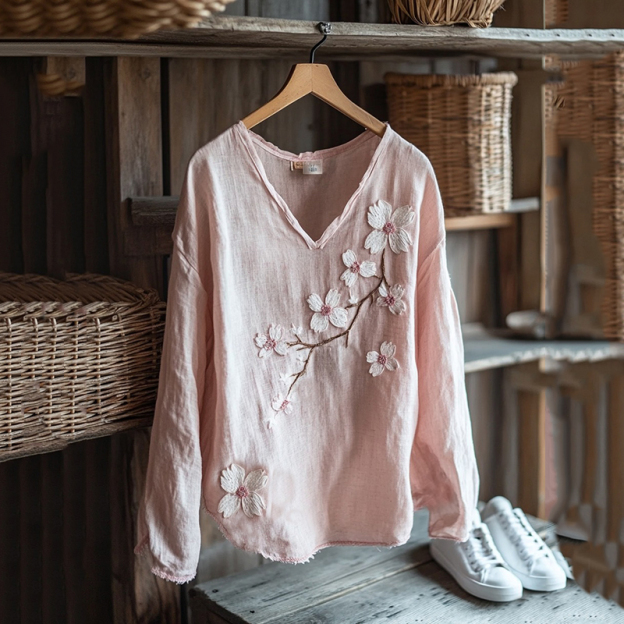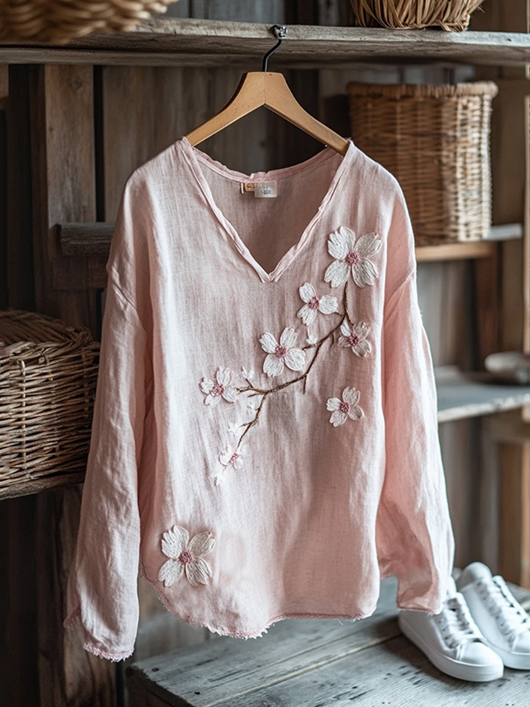 Vintage Sakura Art Japanese Embroidery Graphics Linen Blend V-neck Tunic