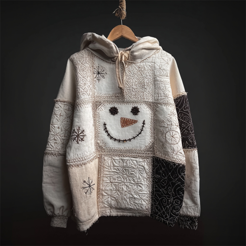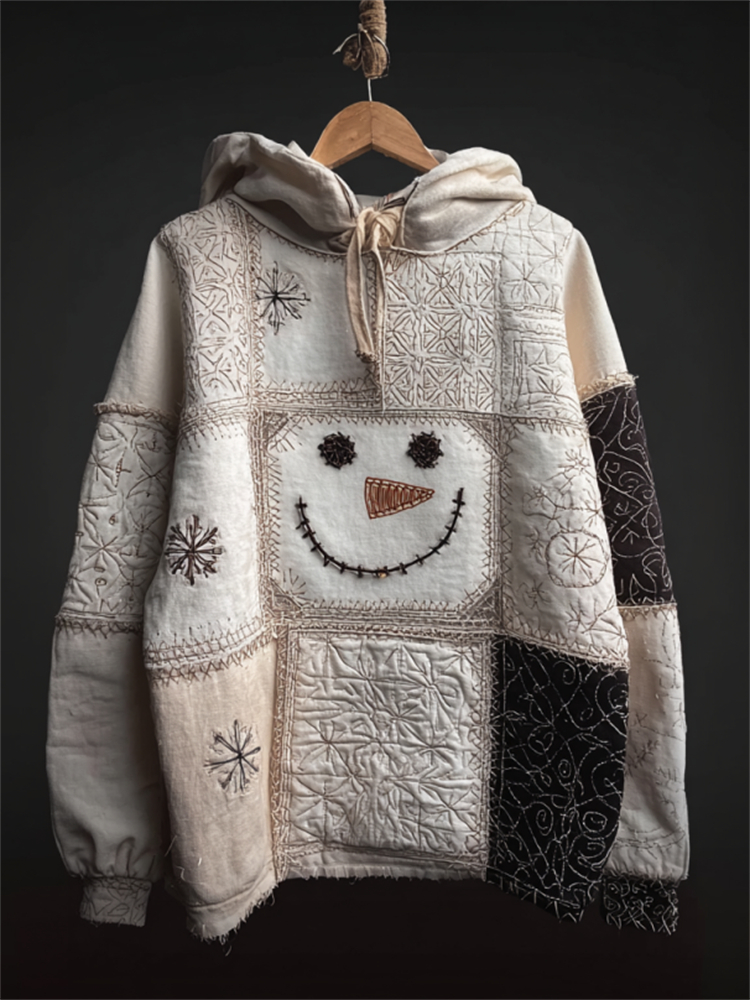 Vintage Snowman & Snowflakes Embroidered Patchwork Hoodie