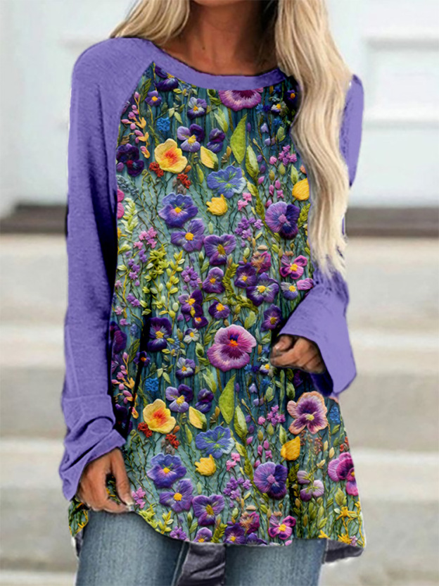 Violet Wildflower Embroidery Art A Line Comfy T Shirt