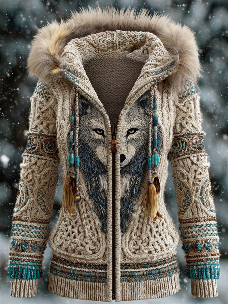 Western Wolf Turquoise Viking Celtic Cozy Fur Hooded Cardigan