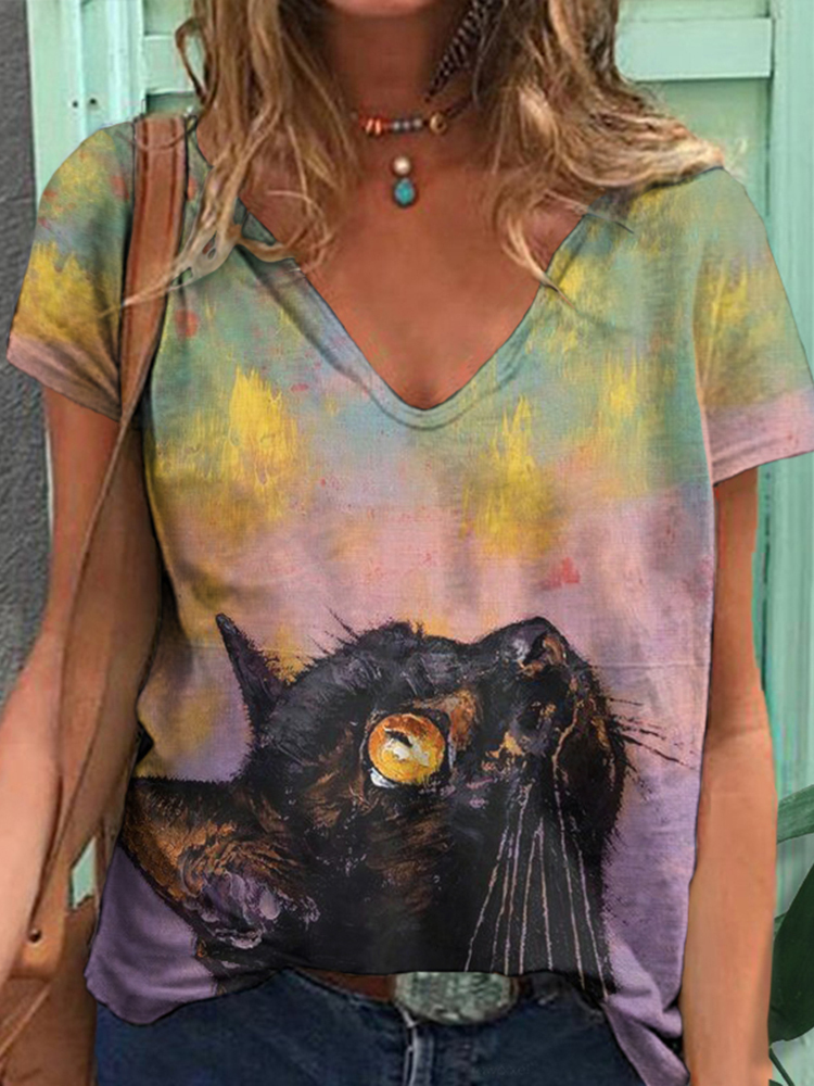 Women's Black Cat In Oil Painting Print V-neck T-shirt