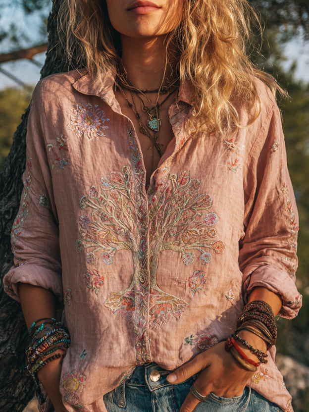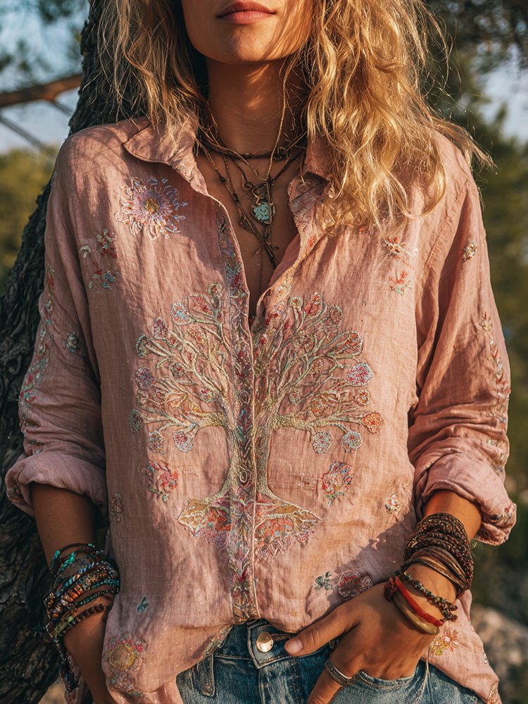 Women's Colorful Tree Of Life Embroidered Cotton And Linen Shirt