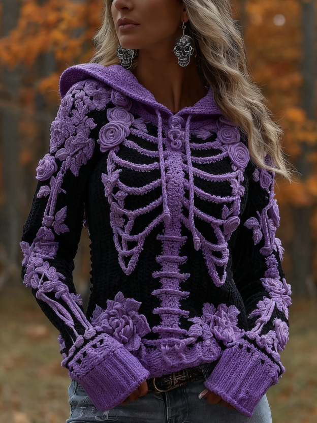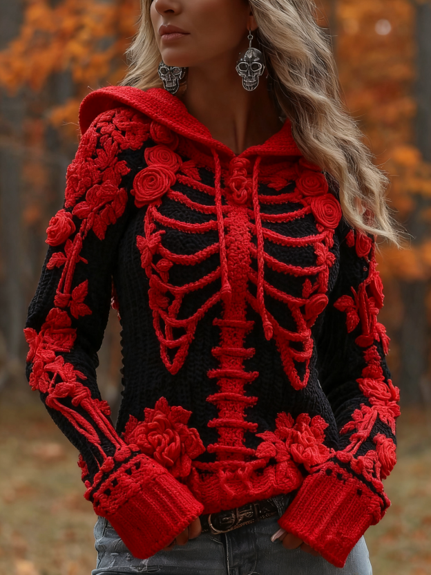 Women's Halloween Skeleton Bones With Roses Art Knitted Warm Hooded Sweater