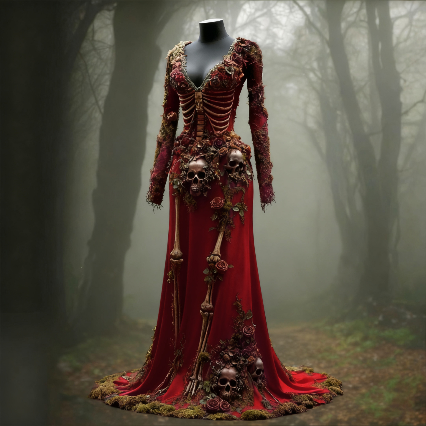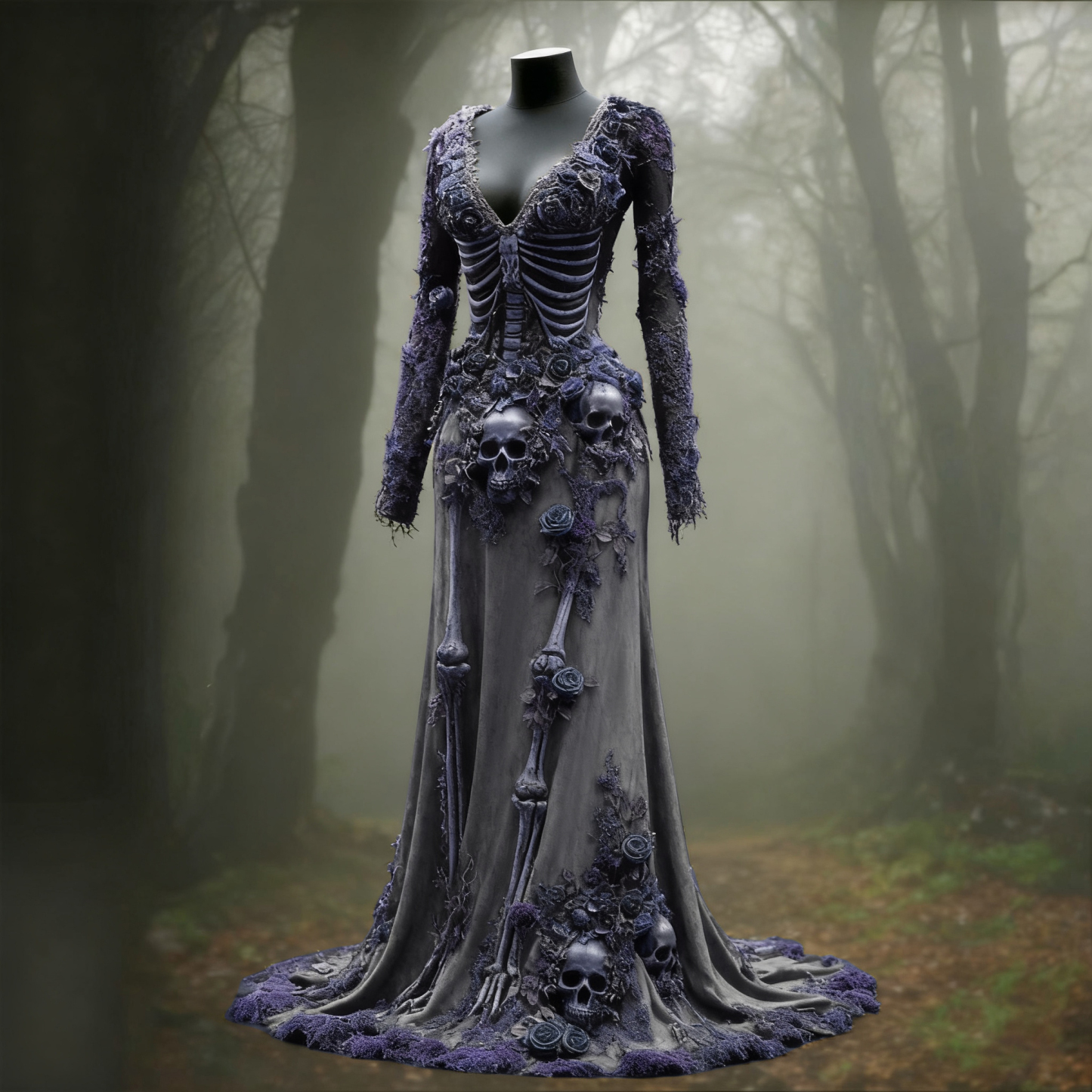 Women's Halloween Skull Flower Moss Witch Velvet Maxi Dress