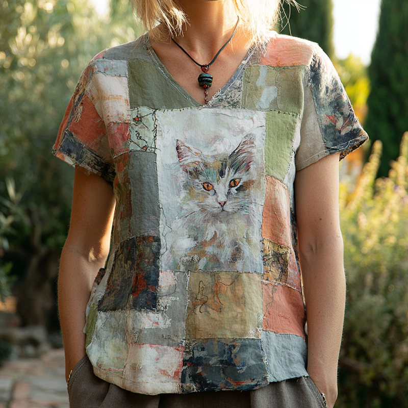 Women's Retro Geometric Cat Oil Painting Art Patchwork T-shirt