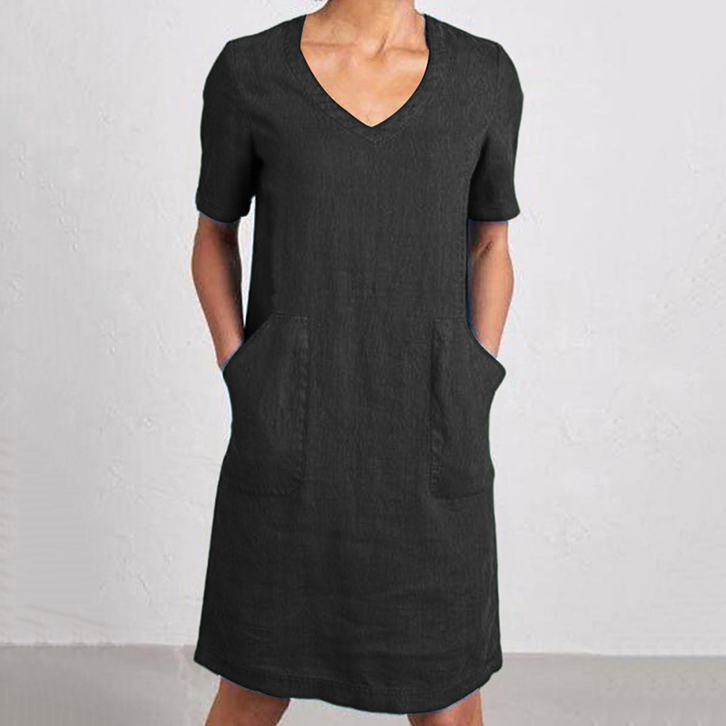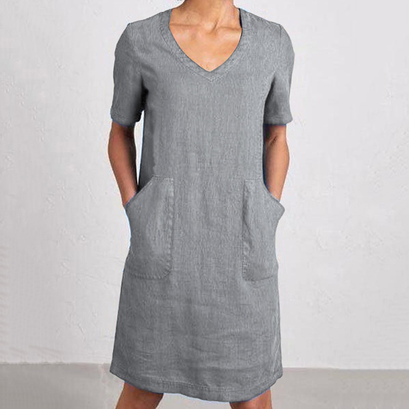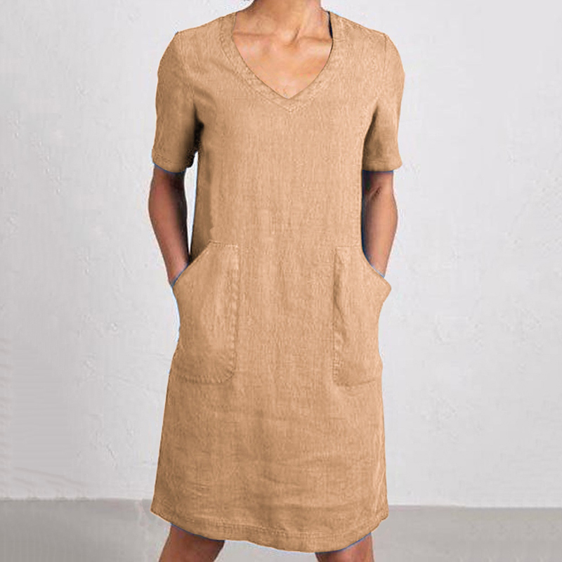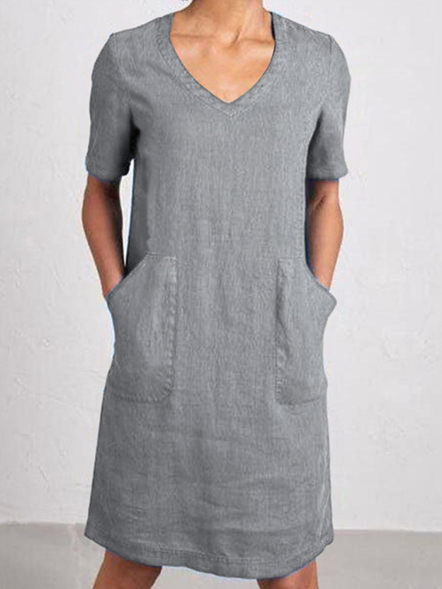 Women's Retro Solid Color Cotton And Linen V-neck Pocket Dress