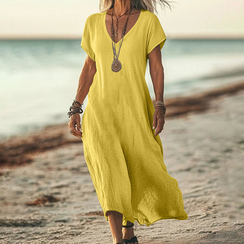 Women's Solid Color V-neck Linen Blend Short Sleeve Dress