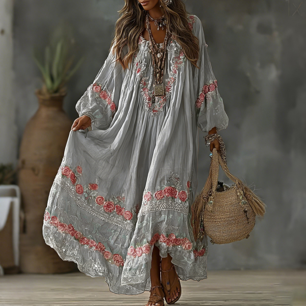 Women's Vintage Floral Art Print Flowy Linen Blend Casual Long Sleeve Maxi Dress