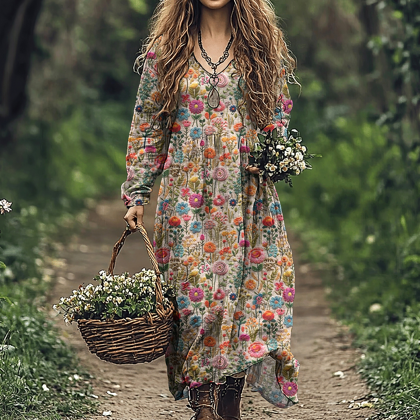 Women's Vintage Flowers Embroidered Linen Blend Maxi Dress