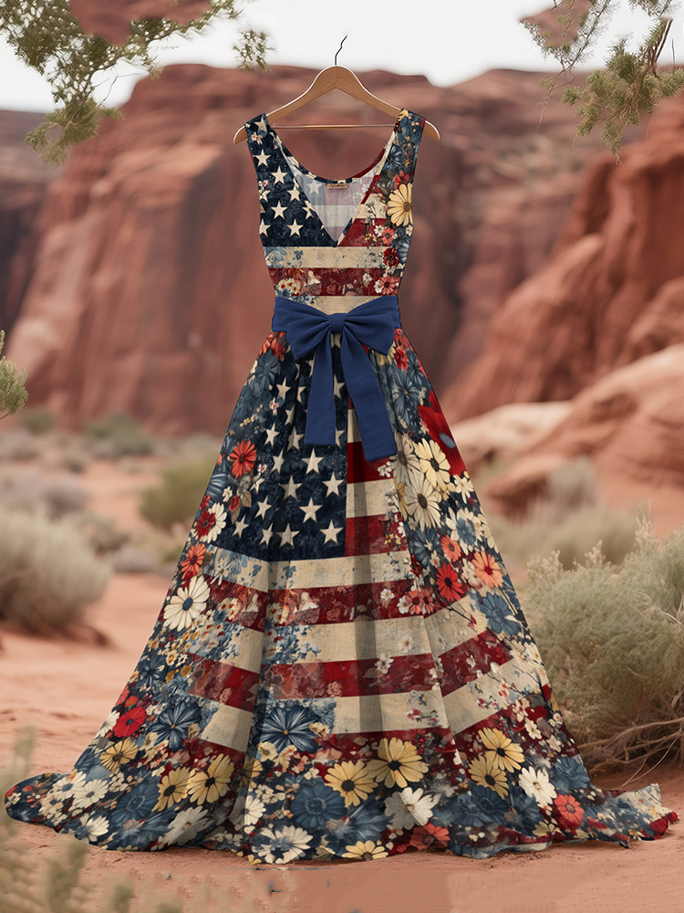 Women's Vintage Independence Day Flag Flower Print V Neck Midi Dress