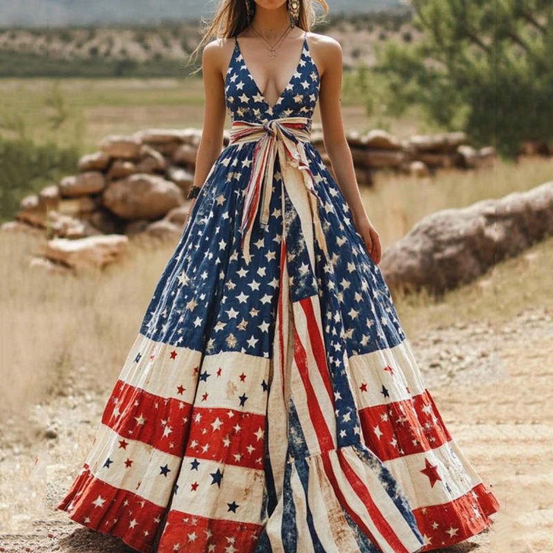 Women's Vintage Independence Day Flag V Neck Sleeveless Dress