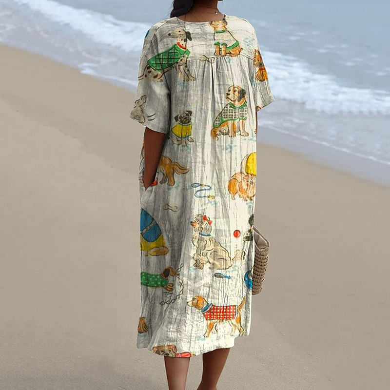 Women's Vintage Lovely Dogs Art Print Midi Dress