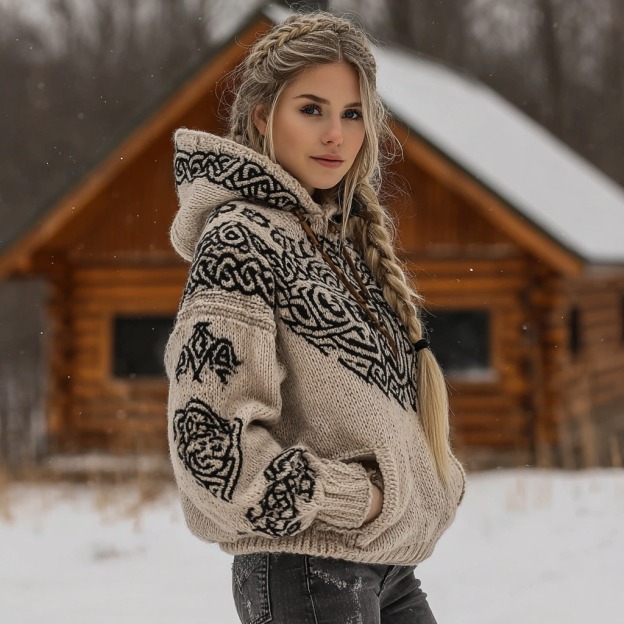 Women's Vintage Viking Celtic Knot Knit Jacquard Hooded Sweater